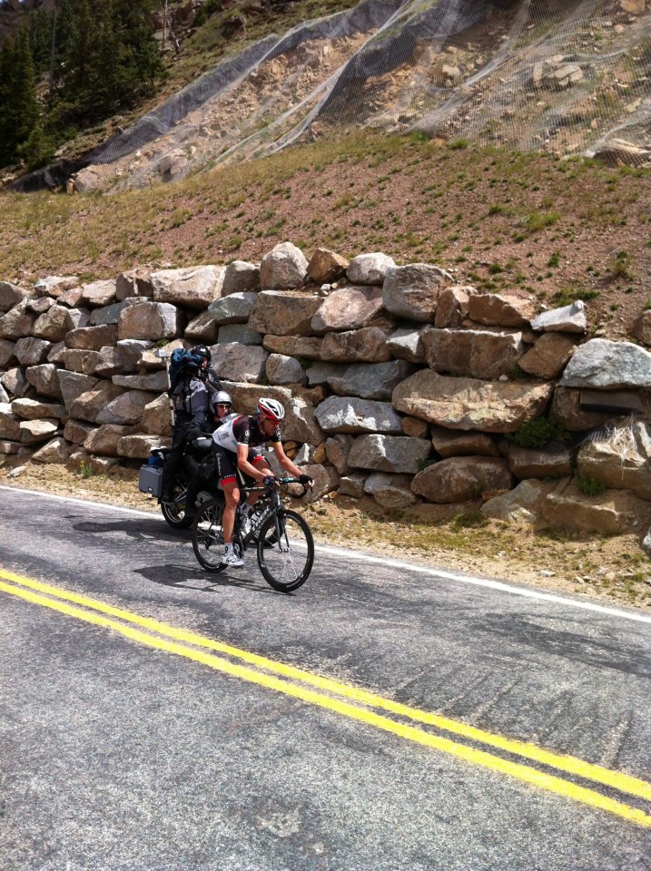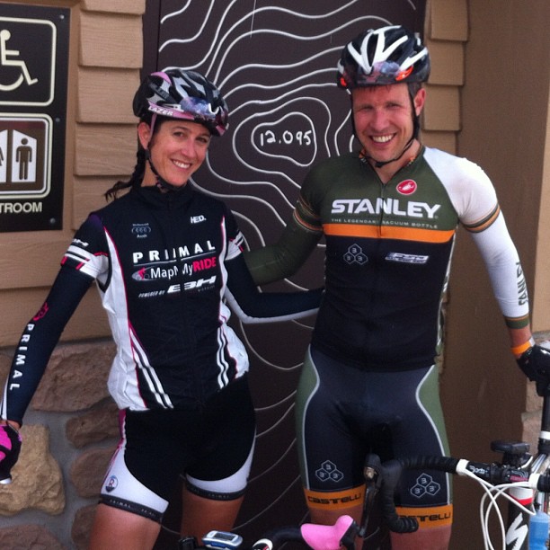 The day after the race I somehow managed to talk Niels into riding to the top of Independence Pass to watch Stage 4 of the U.S. Pro Cycling Challenge. The climb from Aspen to the top of Independence is over 4,000 vertical feet and tops off at a brutally hypoxic altitude of 12,095 feet as shown by our sweet outhouse pose.