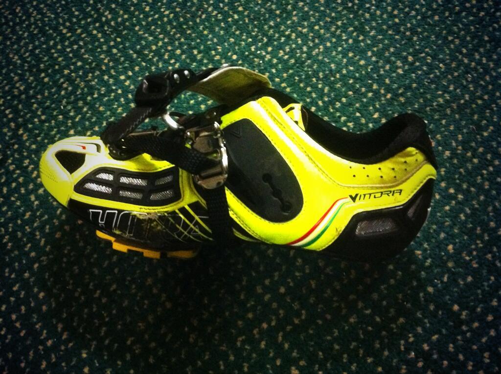 I hit the deck HARD on my left hip and immediately hopped back up to see that I’d broken my left shoe and left brake lever. Neutral support was there immediately and used a toe strap to tie my foot back into my shoe. My brake lever was flopping around but was still held on by the brake cable. I got back on my bike and began furiously chasing through the dropped groups despite a throbbing hip and broken gear.